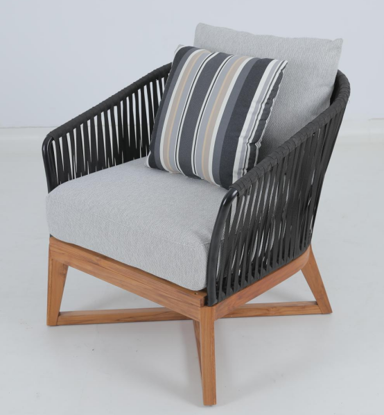 Outdoor loungestoel met hoekig frame omwikkeld met riemen, massieve teakhouten basis, zitkussen, rugkussen en decoratief kussen.Achterkussen stijl: Watervalrand met honkbalnaad.