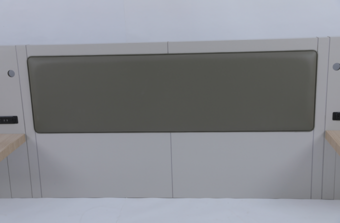 Strak omwikkeld gepolsterd hoofdpaneel met 2 bevestigde nachtkastjes met metalen steunstukken; hoofdpaneel is 82 "W; strak gepolsterd paneel moet bij het hoofdpaneel worden geplaatst;Nachtbankpanelen met toegangspanel voor draadbeheer/toegangspanelen voor lichtinstallatiesBeide panelen/nachtbank zijn 25"W, elk met uitsnijding voor leeslicht; nachtbanen zijn 18"D x 23"H; Mini/ multimedia hub gemonteerd op de voorzijde van het nachtbankpaneel met/ twee standaard stopcontacten en twee USB-poorten.Hoofdpaneel dat in drie stukken moet worden geconstrueerd en aan elkaar bevestigd en aan de muur gemonteerd om het uiterlijk van één hoofdpaneel te gevenL/R Hoeveelheden TBD. Verlichting COM; Stof COM - 1,75 yds vereist.